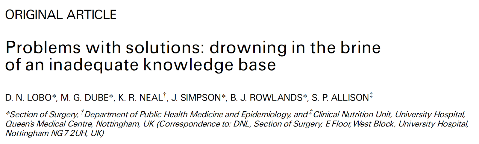 Lobo, D.N., Dube, M.G., Neal, K.R., et al., 2001. Problems with solutions: drowning in the brine of an inadequate knowledge base. Clin. Nutr., 20(2):125-130.
